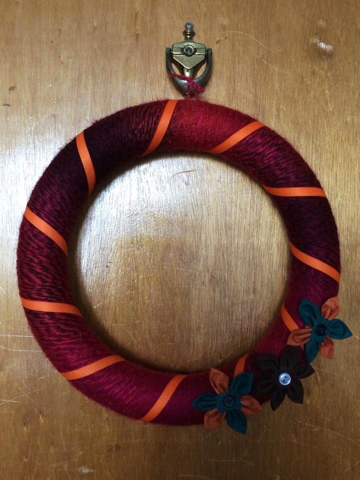 Besides handbags, cardholders, aprons, and doggie scarves that I make for the store…I like to spend some of my free time making other crafts just for me. This past weekend I made a spring/summer wreath with yarn and little fabric flowers, and I plan on hanging it outside of my front door. Last fall, I made a similar wreath that I hung on my door which was also made of yarn. Making this wreath, made me want to share some of my recent and past creations that I have made for myself and for other people.