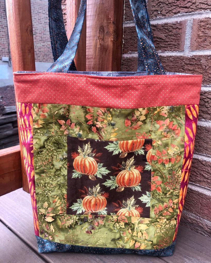 Happy almost October! You can tell that fall and Halloween are on my mind! I wanted to share some of my new tote bags and pouches. This first tote is a pumpkin patchwork tote, great to use as a market tote or a trick or treating bag. This little pumpkin patch came from a paper piecing pattern I bought from: https://www.etsy.com/shop/CenterStreetQuilts which also has other great paper piecing patterns.