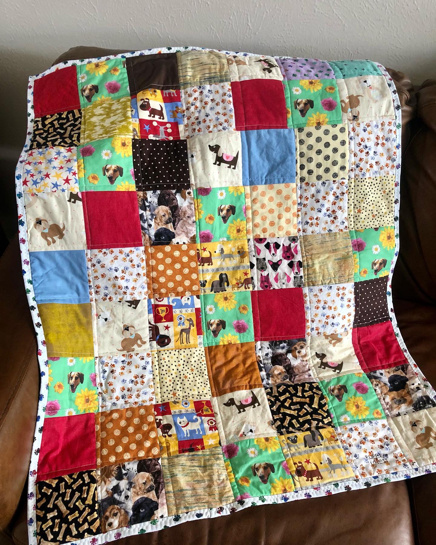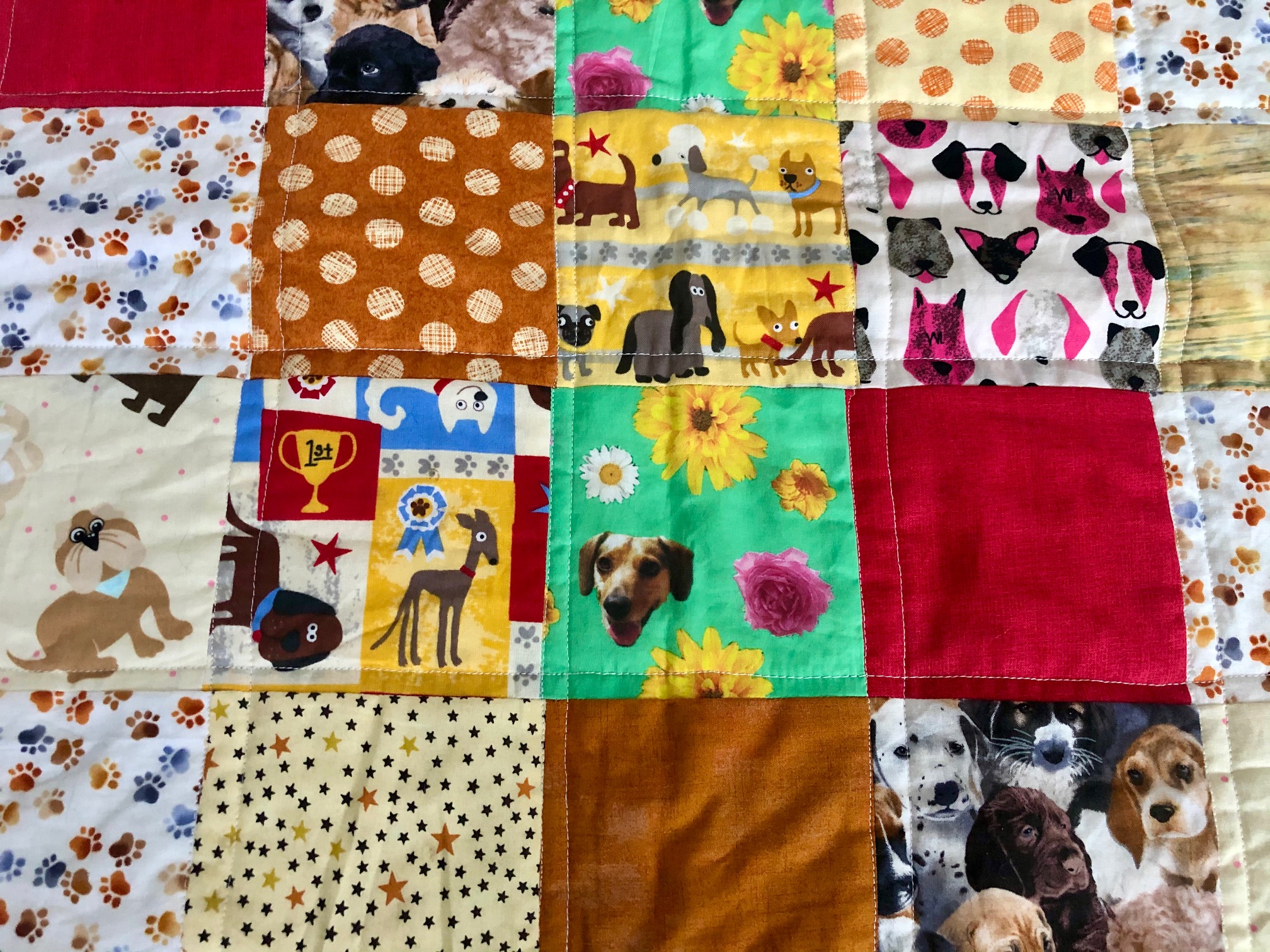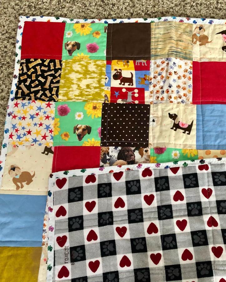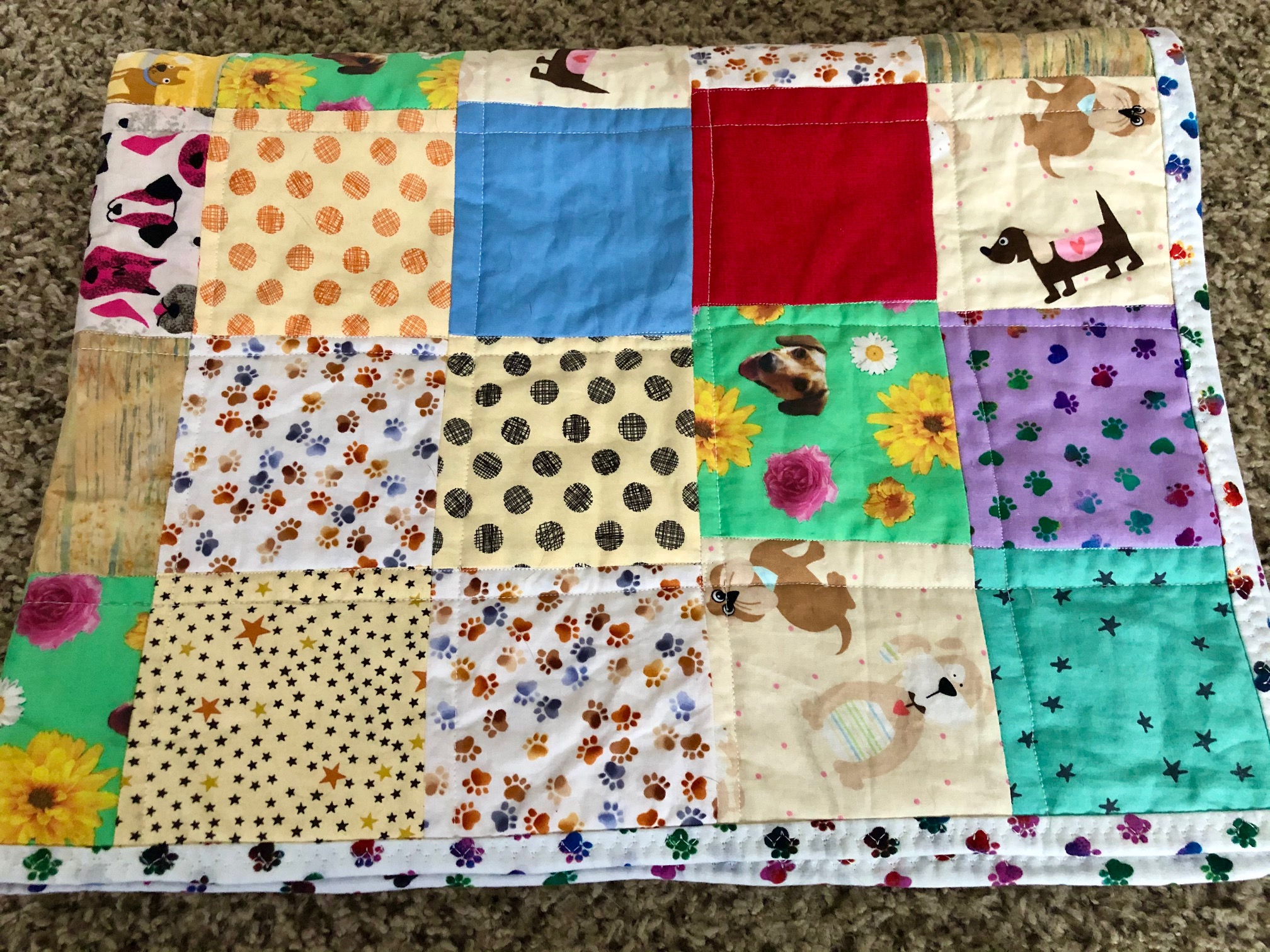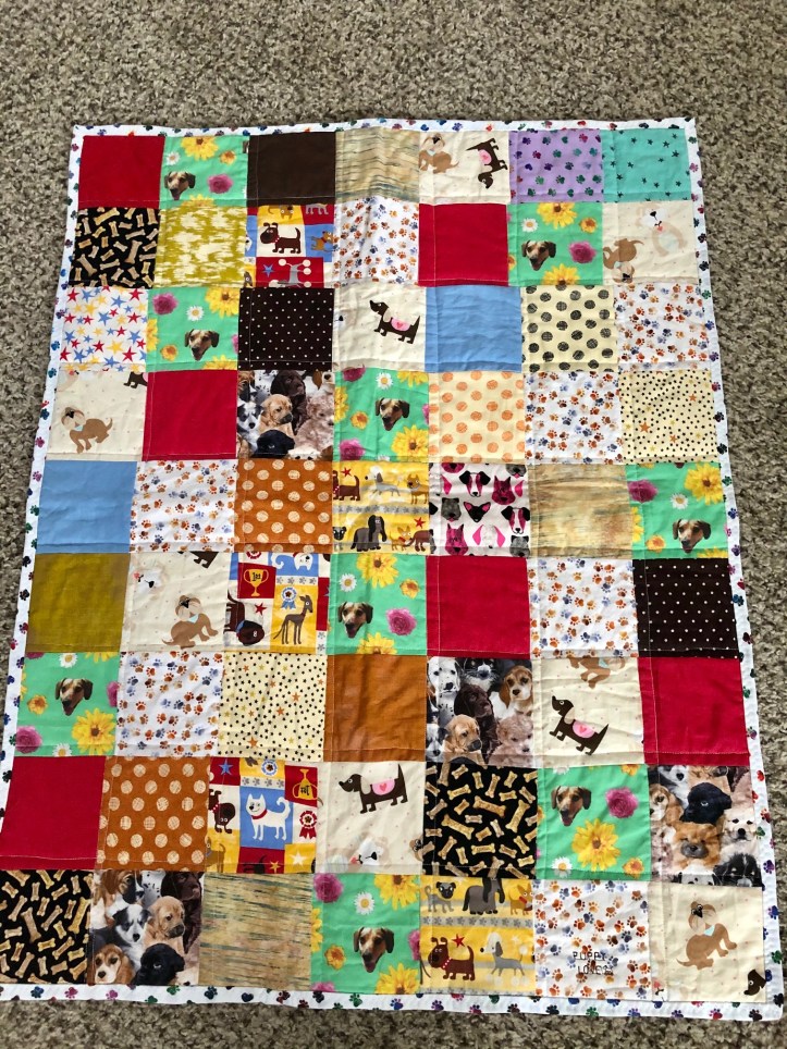 A Couple weeks ago, I finished another quilt! This quilt is a little smaller, and I made it a dog themed quilt! I used several scraps of dog fabric I already had, and made a patchwork quilt with straight line stitching on top.