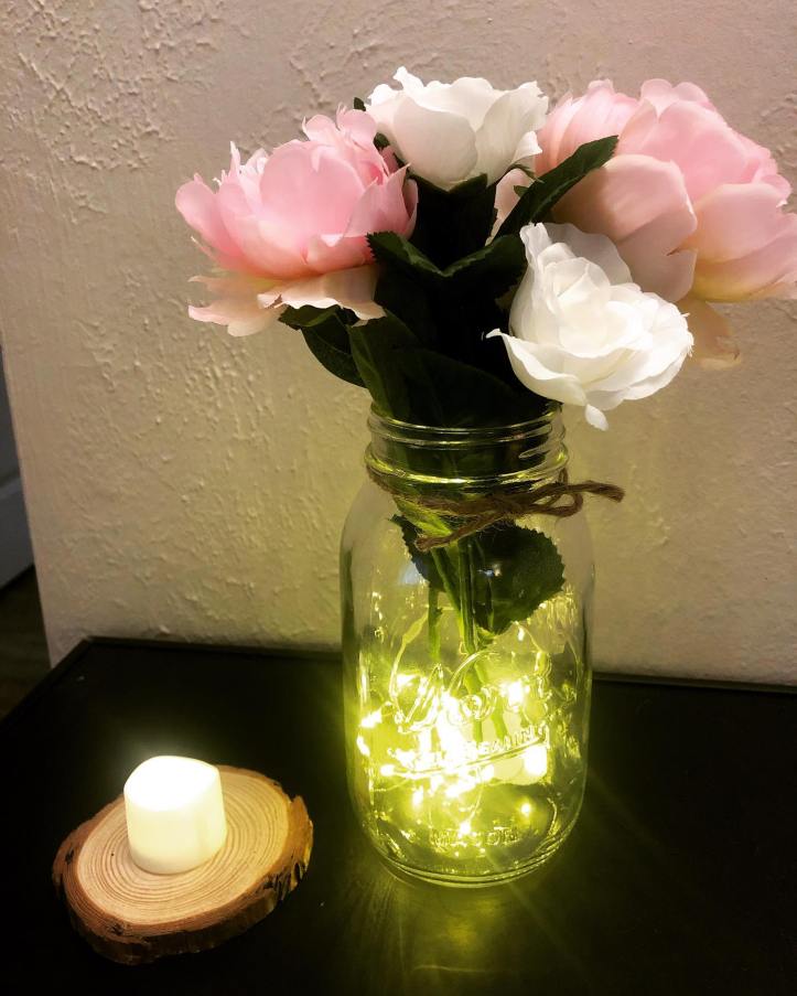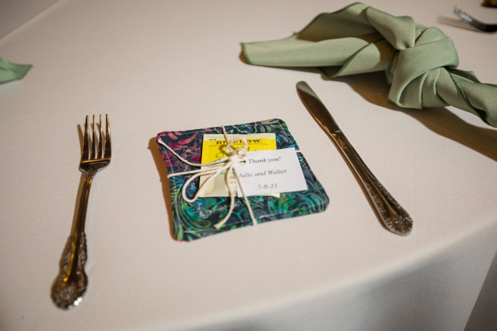 I also made my own centerpieces, they were so easy! I used recycled mason jars and filled them with extra flowers and fairy string lights (of course I saved one centerpiece for my home décor). I also made the wedding favors, which were quilted coasters and attached a tea bag to each coaster.