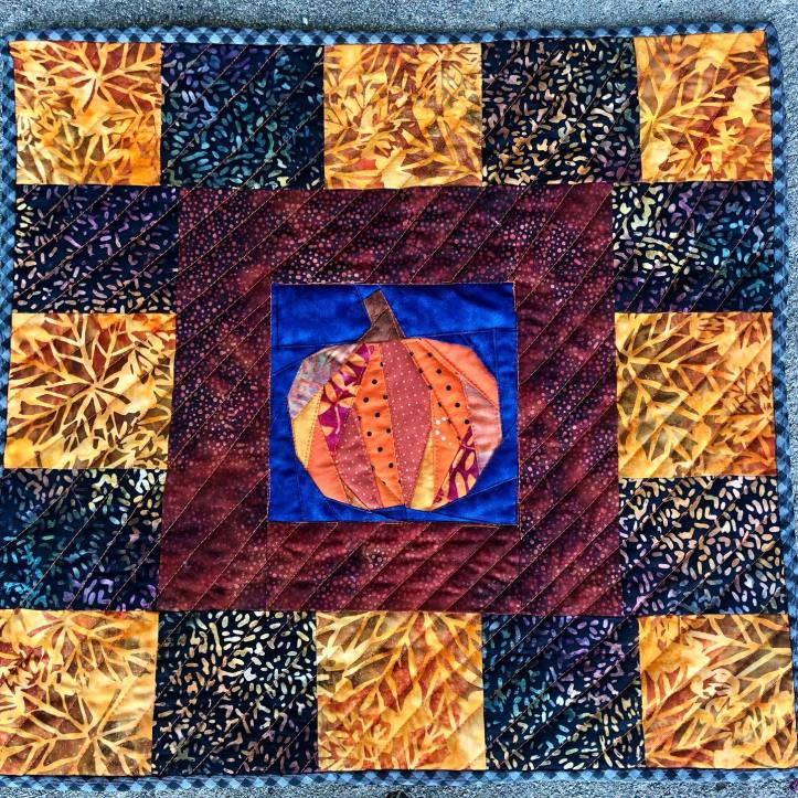 My favorite is the little pumpkin mini quilt. I think the colors work very well together. The quilt is made mostly from Batik fabrics, and the pumpkin was made from a paper piecing pattern – credit Kohatupatterns.