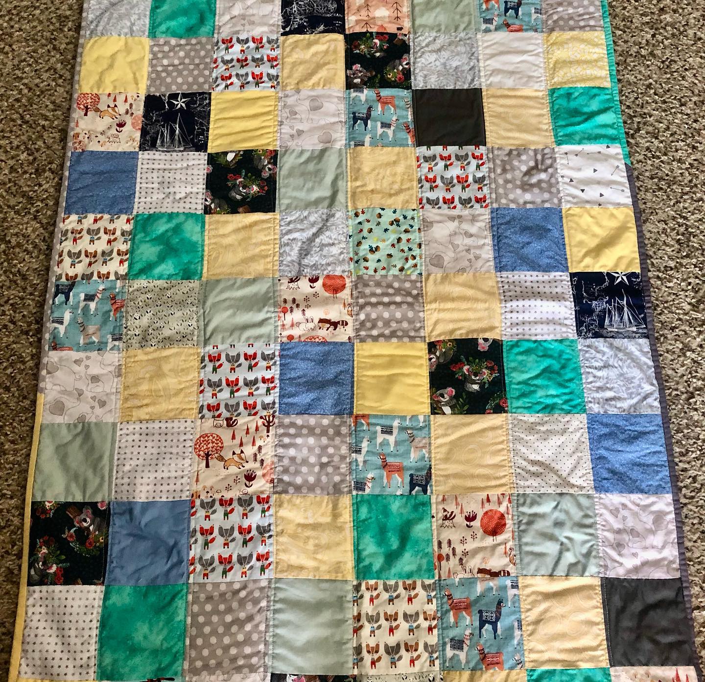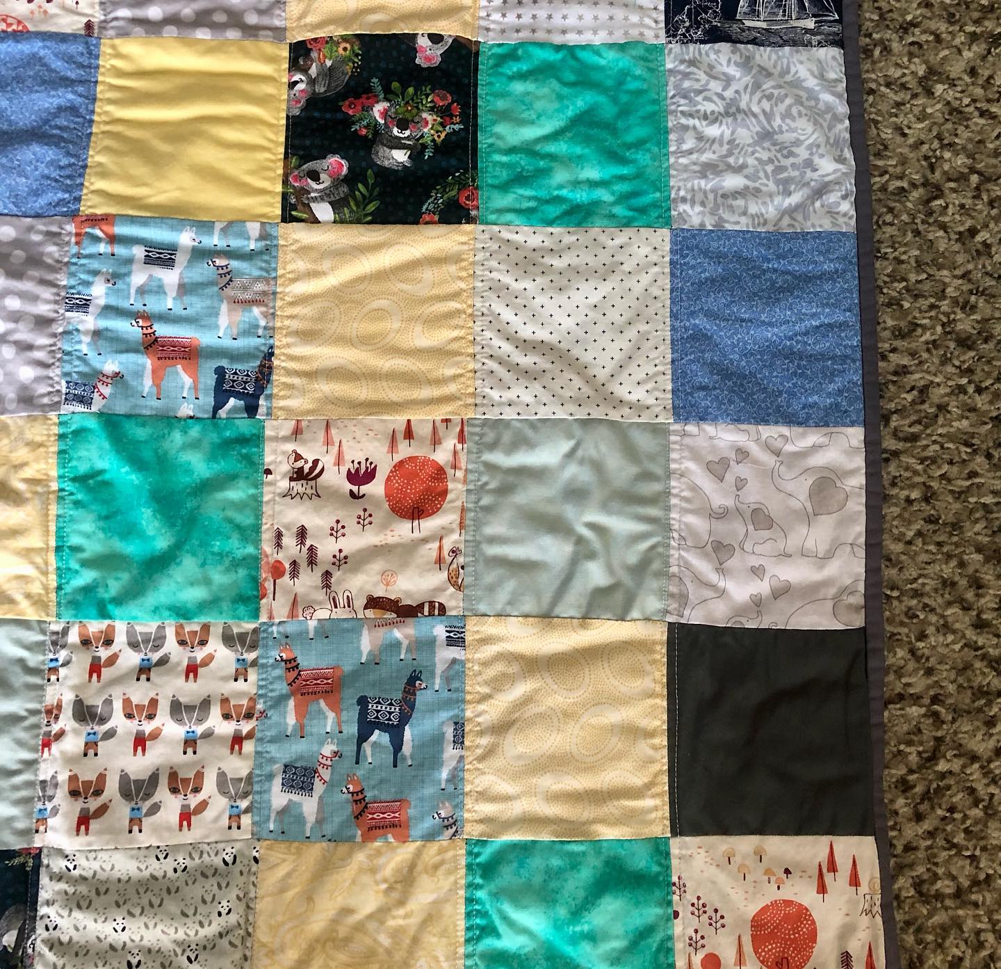 They are expecting a baby girl, but the nursery is painted with neutral colors, so I wanted the quilt to match the nursery color theme that includes yellow, gray, baby blue, and mint green.