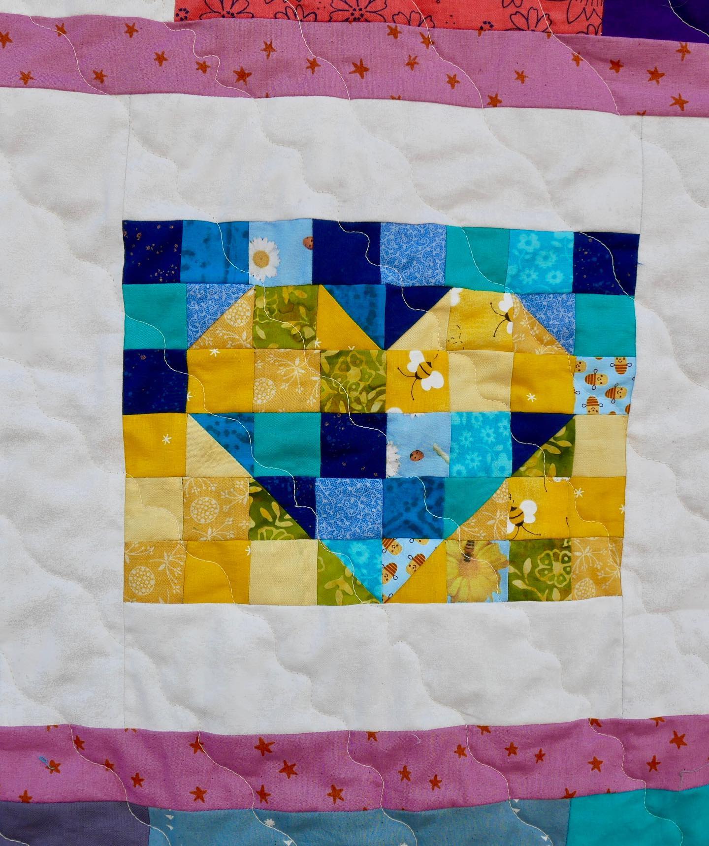 The heart in the middle of the quilt was made from a paper piecing pattern called “Rise of Freedom.” I bought this pattern from an Etsy seller/pattern designer from Ukraine. Her paper piecing patterns are adorable. Check out her Esty page at: https://www.etsy.com/shop/SashasQuilts