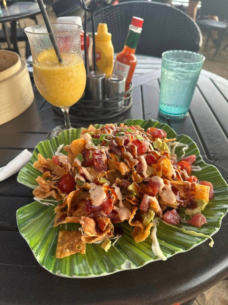 The first restaurant we ate was at “On The Rocks” which was located right by the water, and we watched a beautiful sunset. I had some delicious Poke Nachos! Poke (ahi tuna) is a hit in Hawaii.