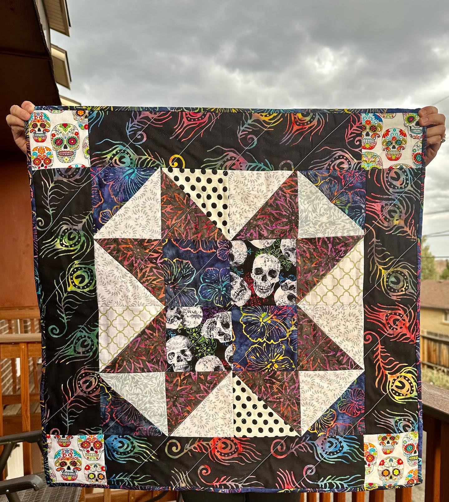 I decided to do a Hawaiian/Day of the Dead theme for one of my mini quilts, where I combined the Hawaiian fabric with a few skull fabrics I had. I think the fabrics on this quilt collaborated very well!