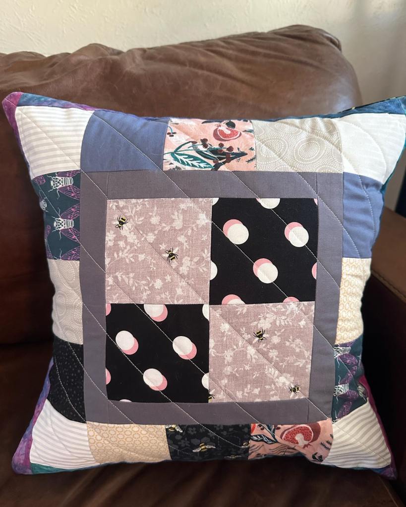This bee/pollinator theme quilted pillow was also made from fabric scraps I kept, and is now included on our living room couch. And the patchwork tote bag on the left is available on my Etsy!