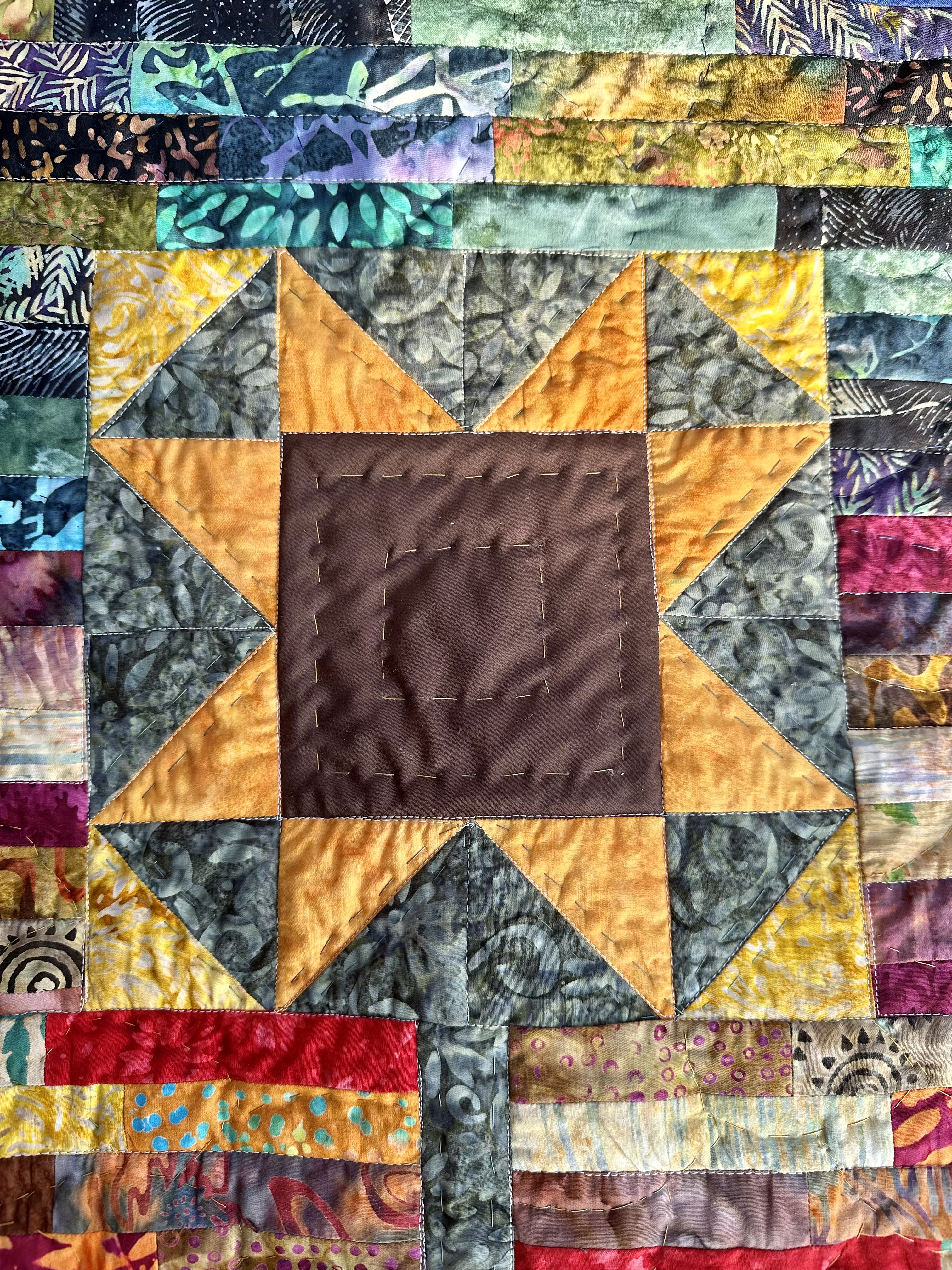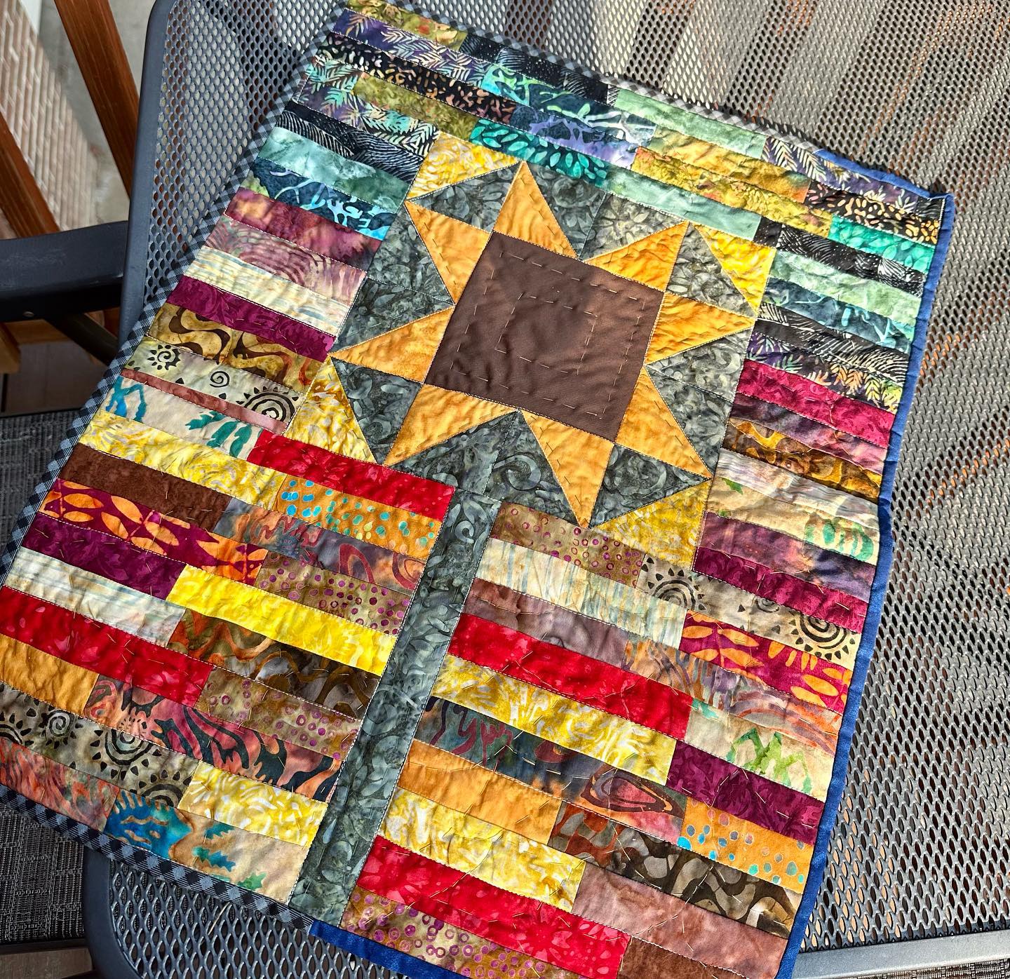 It is summertime!! And might I mention it has been rainier and cooler here in Denver this year. I wanted to show off some of my creations I have made in the past few months. I’ll start off with this adorable mini quilt I made from some of the Batik fabric scraps I kept. Colorado has some beautiful sunflowers in the summer so I wanted to make this quilt to resemble a sunflower, and I even added some Hand quilting!