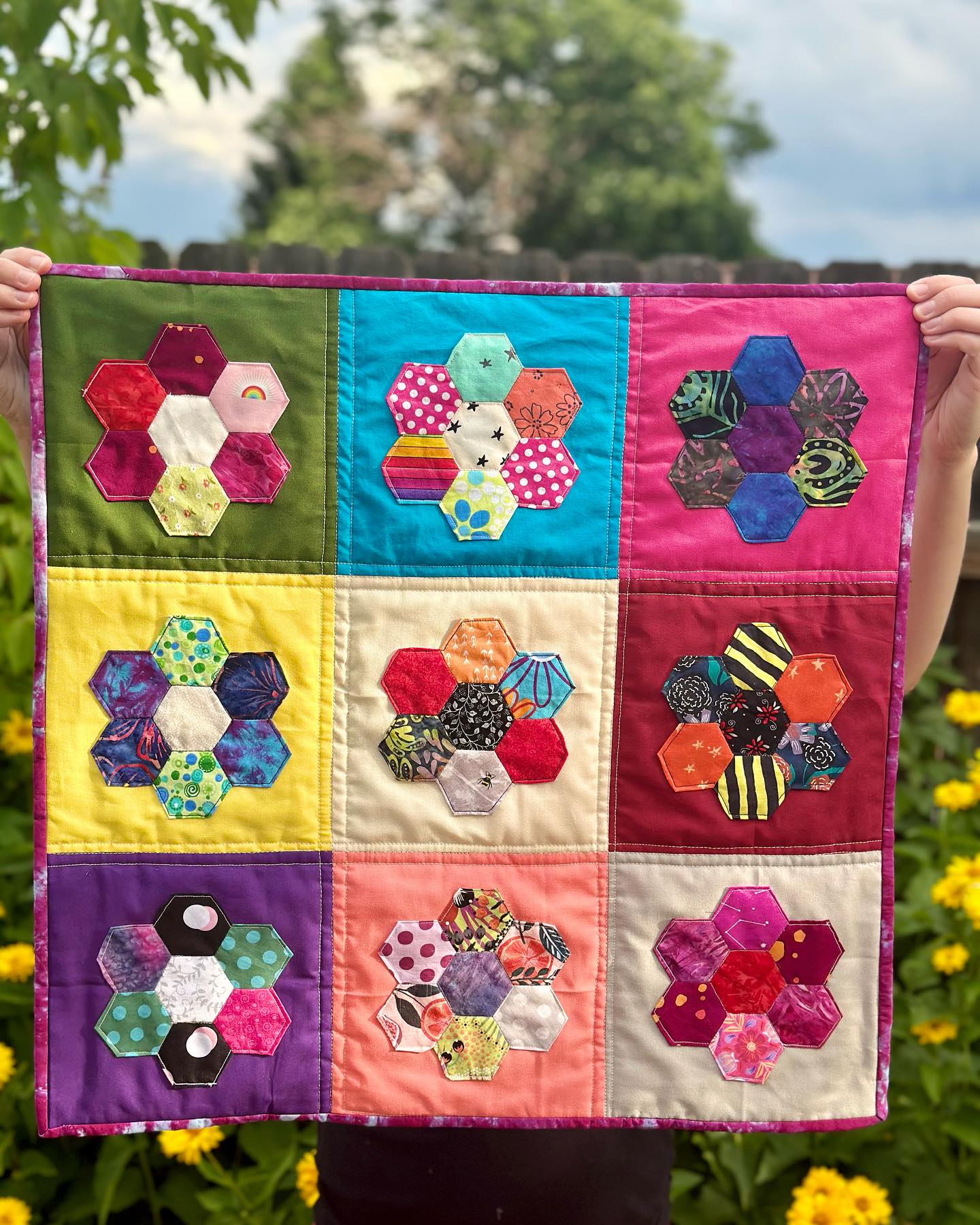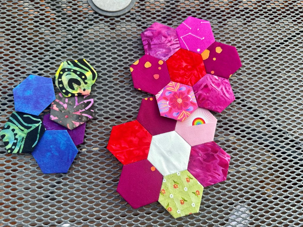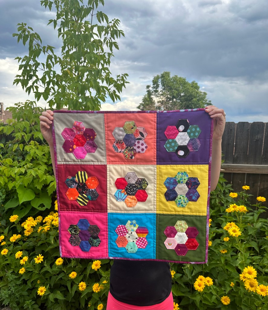 Hello Everyone and Happy Midsummer! So last month, I joined The Denver Metro Modern Quilt Guild, which is a local community of quilters who get together at least once a month for meetings, gatherings, retreats, etc. I am very excited about this, because I get to meet with people with the exact same hobby as me! In the meetings they discuss future events, do show and tells on quilt challenges, and teach some quilting skills. The first meeting I went to in June, we learned how to English Paper Piece (EPP).