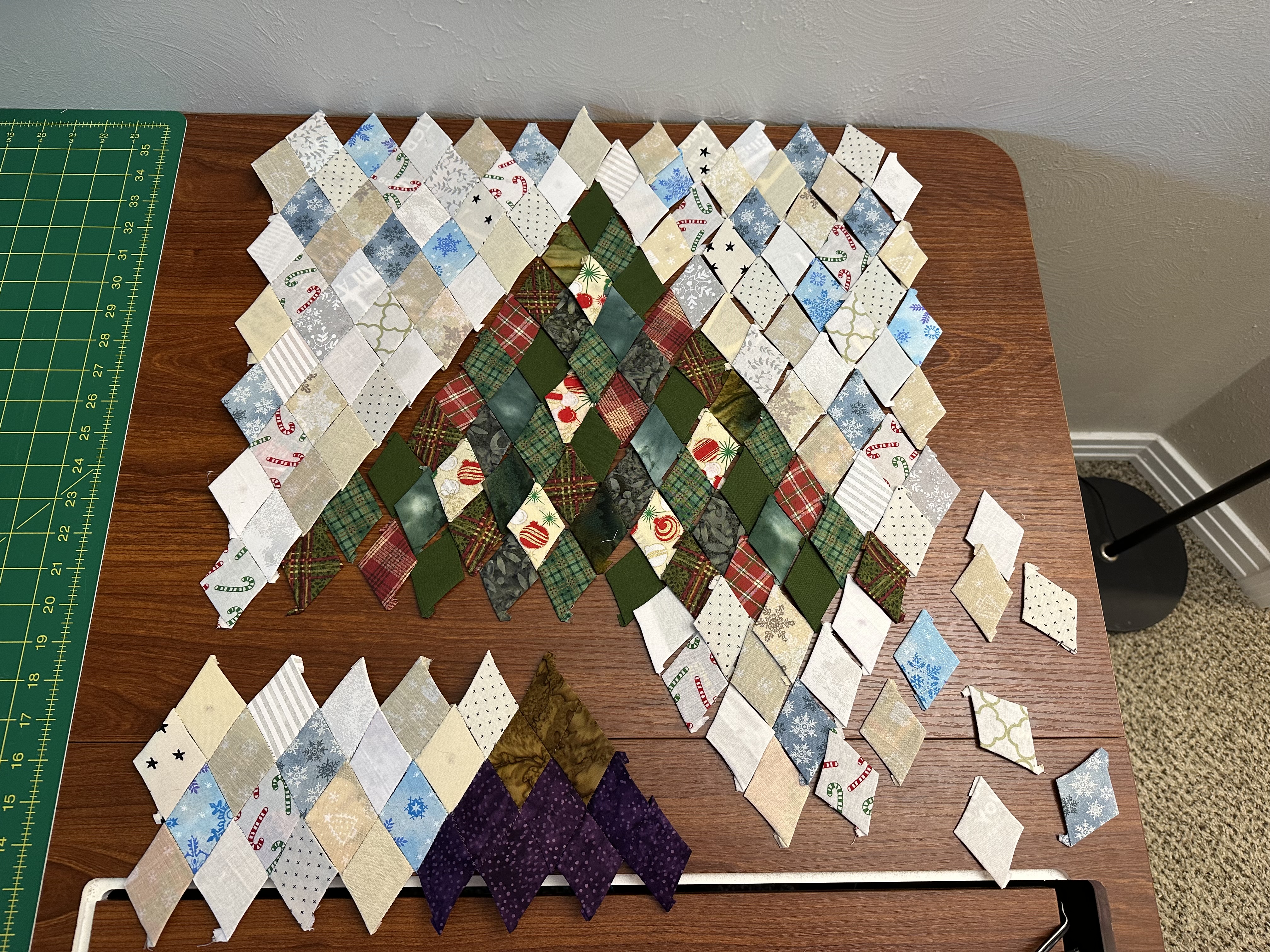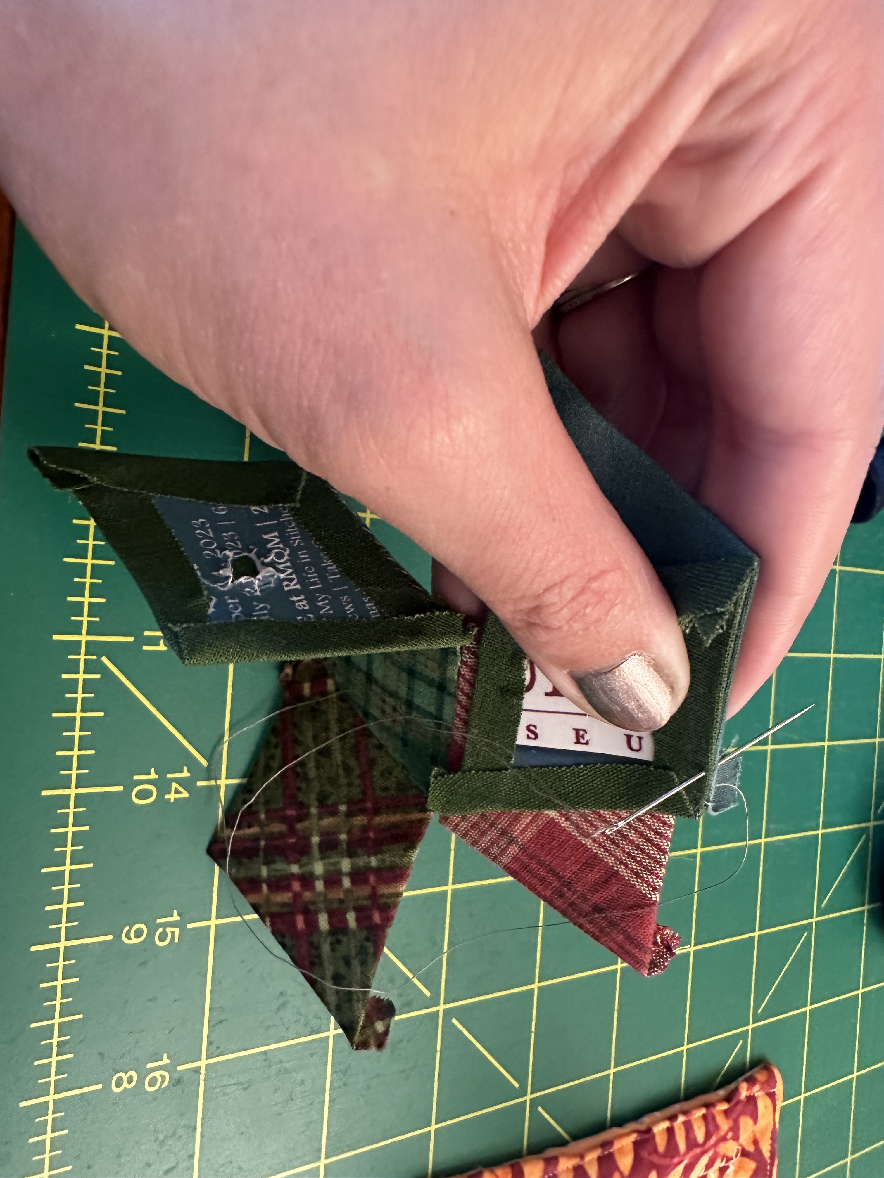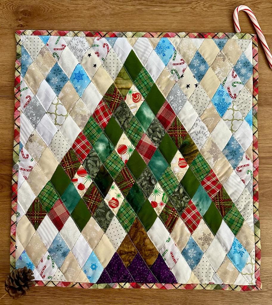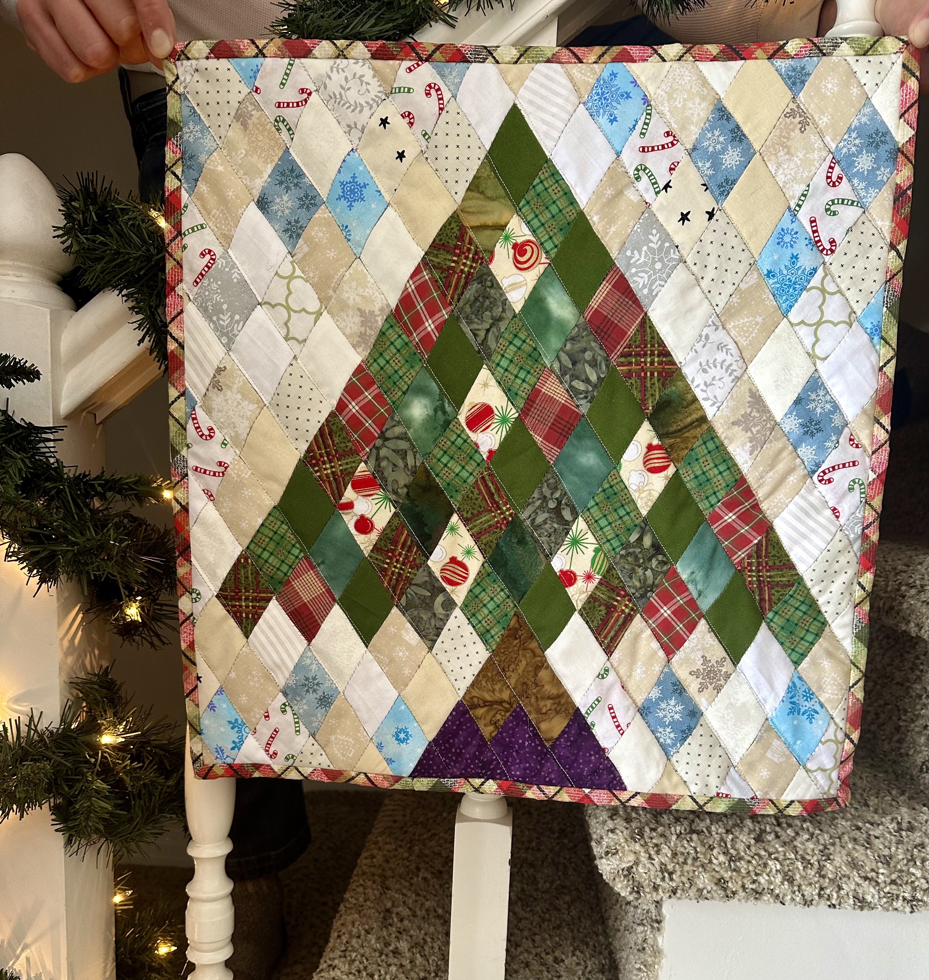 Here are the last creations of 2023! The first is a Christmas Tree mini quilt, and I started this quilt in September, since it took longer to make. I made this by English Paper Piecing so it was all hand sewn. Lastly, I did some “stitch in the ditch” and added a Christmas binding. I created the pattern myself, and it is currently hanging in my sewing/guest room.