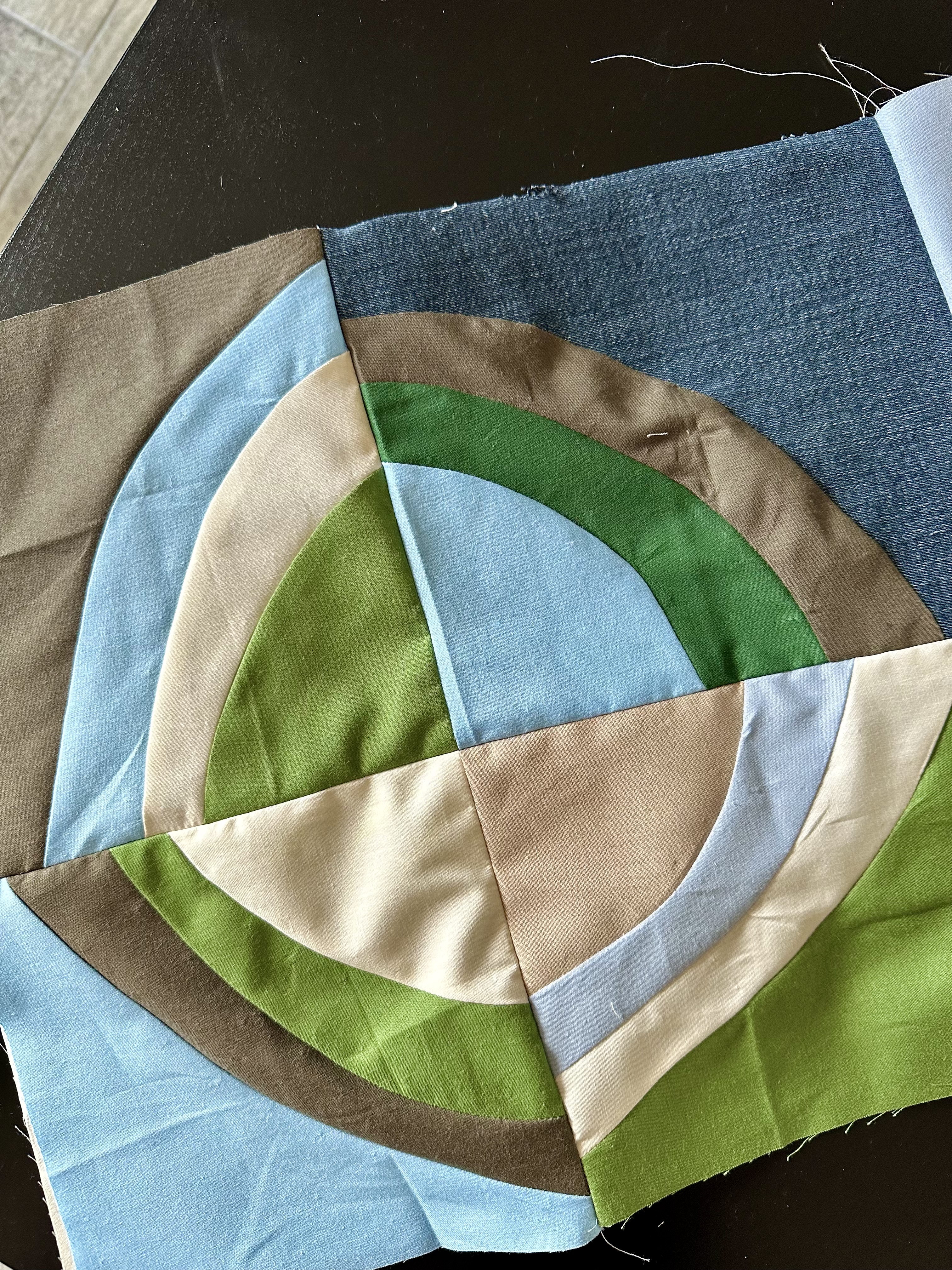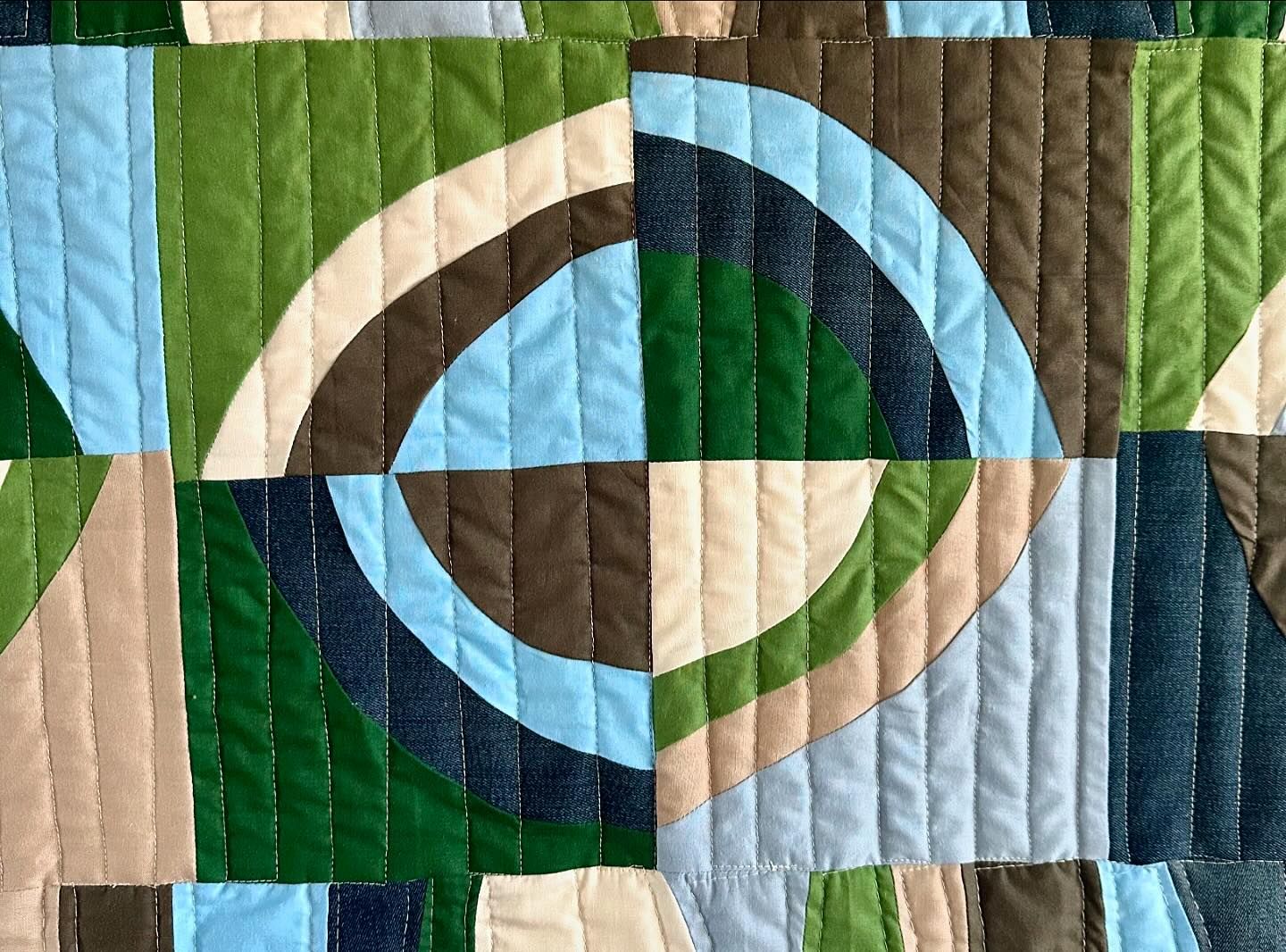 I really enjoy doing improv quilting and with this one I did mostly improv circles. I used mostly cotton neutral colored fabrics and snuck in a few upcycled denim materials.