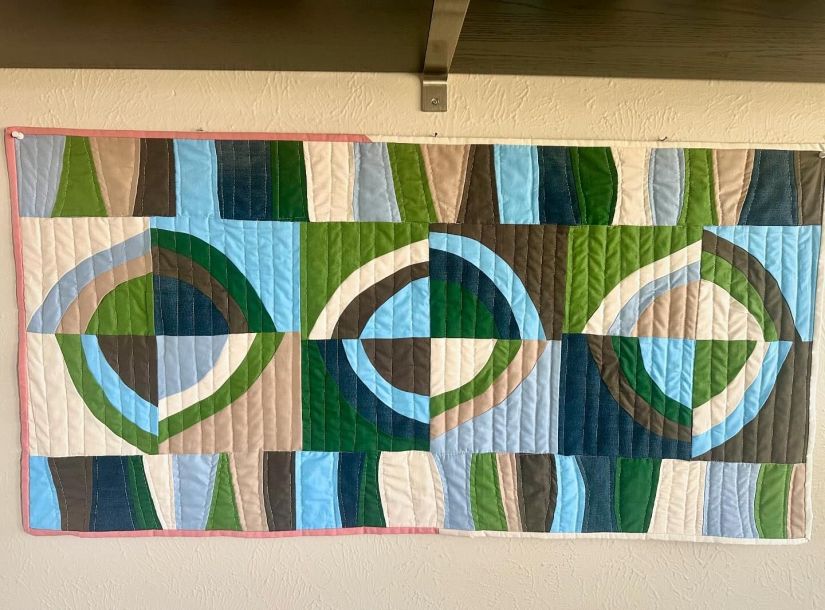 At the end of May, I completed a mini improv quilt that is now hanging in my living room above the couch.