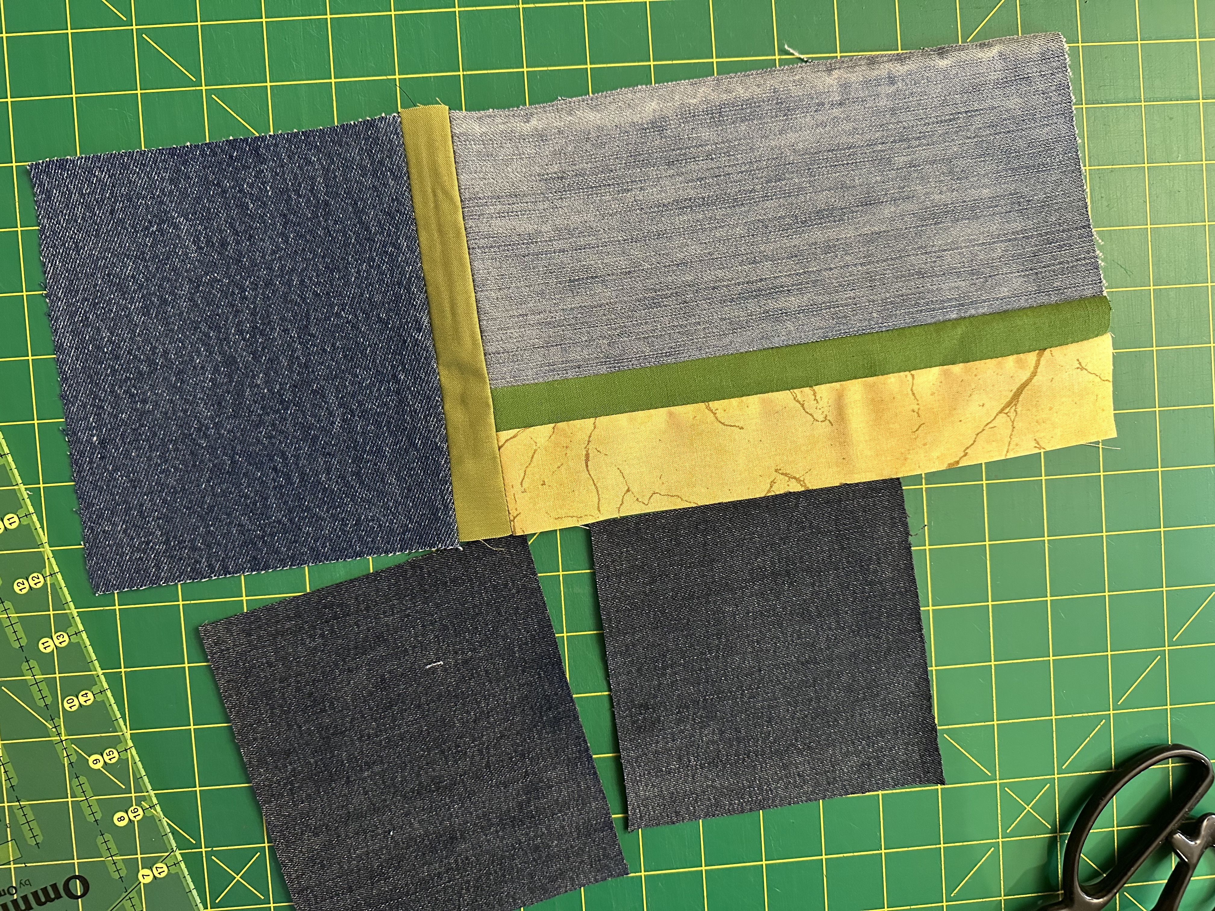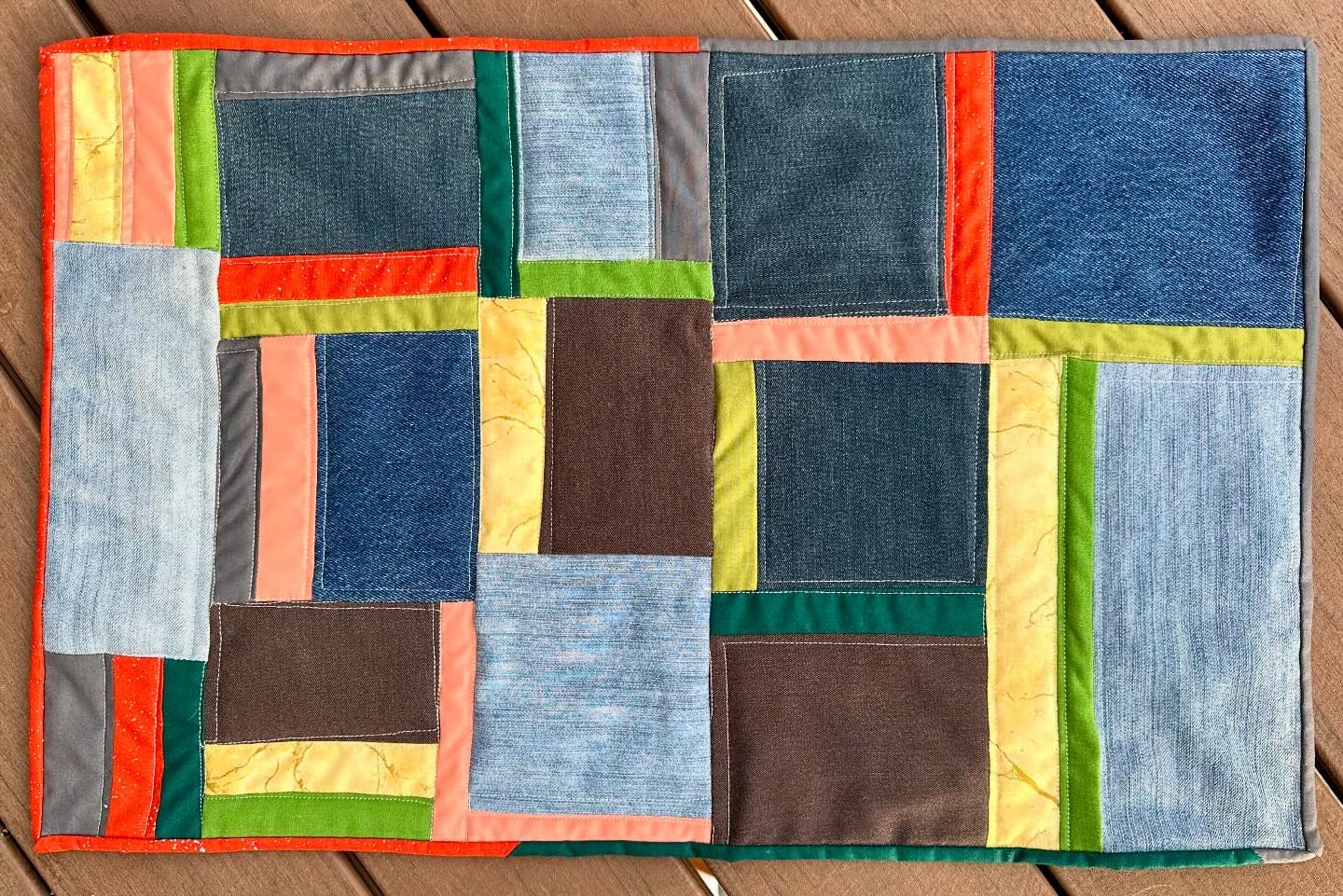 Last year, The Denver Modern Quilt Guild started an annual challenge called “Adventures in Quilting” where each year has a different challenge. This year’s theme was “Light and Dark with an alphabet twist,” so, each member would make a quilt with light and dark colors and include an element in the quilt with a letter they selected. Earlier this year, each guild member drew a letter, and the letter I drew was D. I ended up making two mini quilts for the challenge that included light and dark colors, with something in the quilt that incorporates the letter D. The first quilt I made was a mini quilt made with light and dark Denim (from my letter D selection) fabric scraps, and also included in some cotton fabrics to blend in.