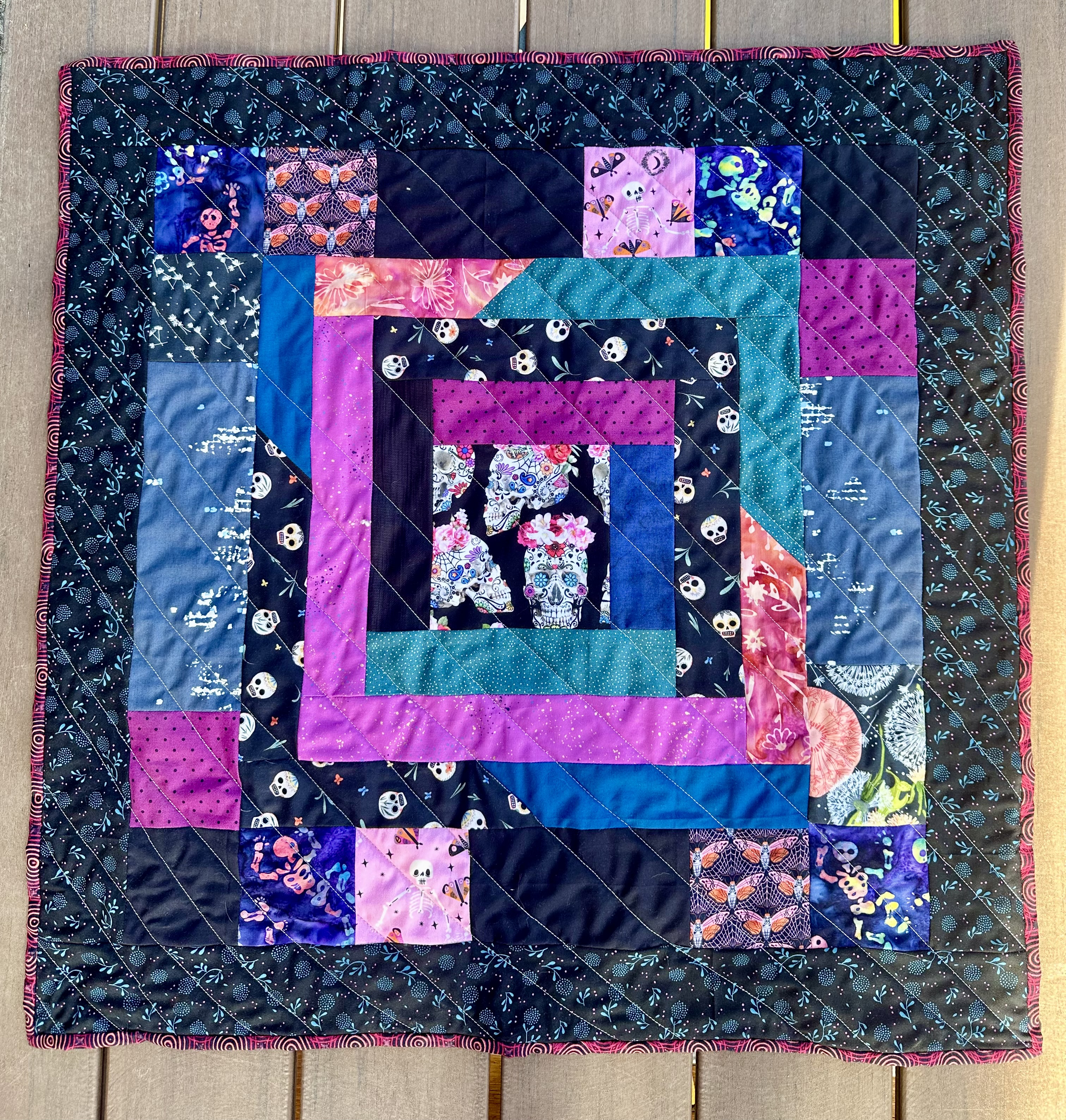 The second quilt I made was Day of the Dead theme – which I incorporated with the letter D. I used mostly dark colors but included light thread quilted top stitch with diagonal lines which also incorporated in the quilt with the letter D.