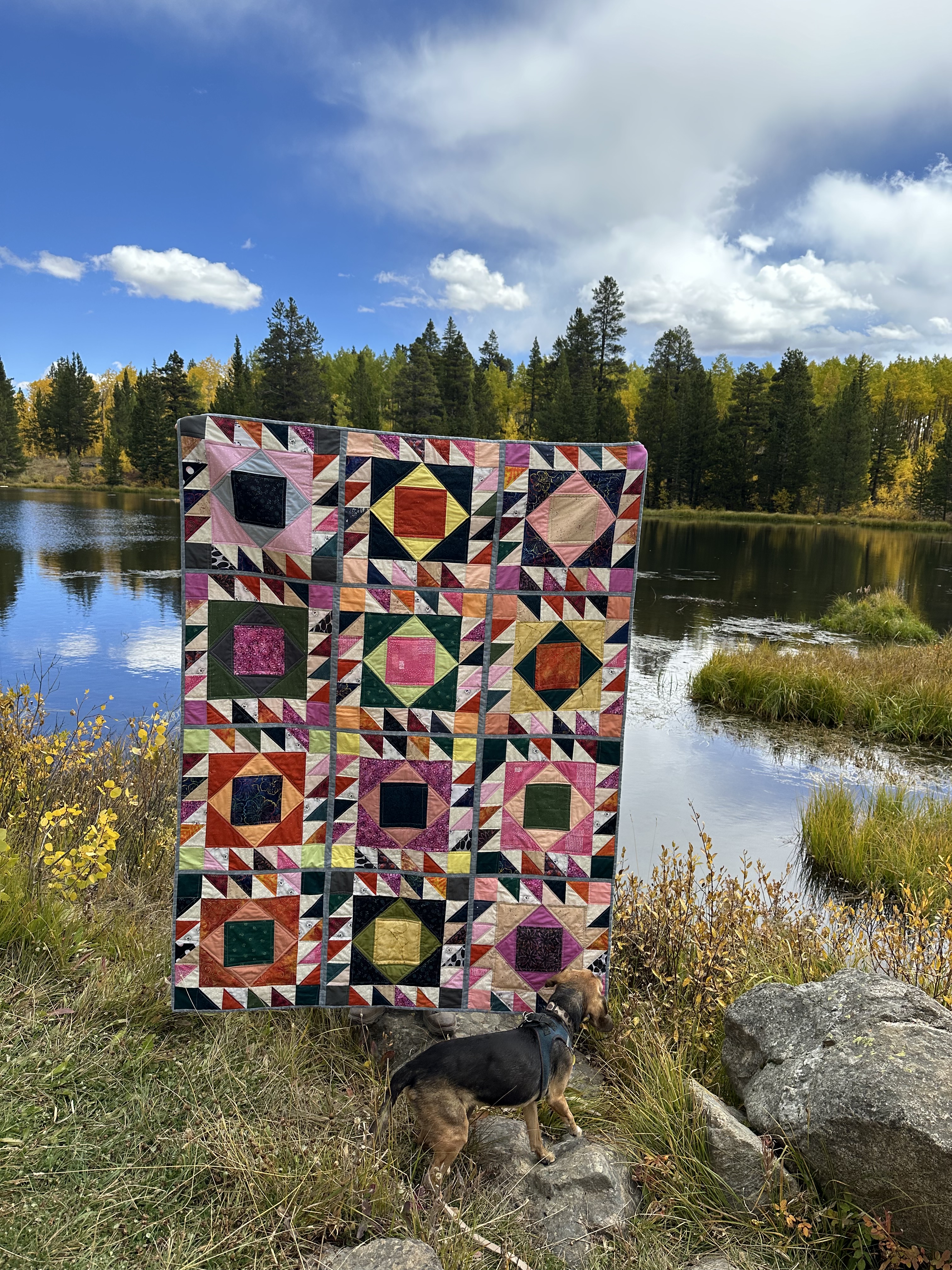 I really love how the photos turned out. We took photos of the quilt along with the aspens, a small lake, and on a small bridge on the trail. Of course, Lilly dog wanted to participate in the shoot.