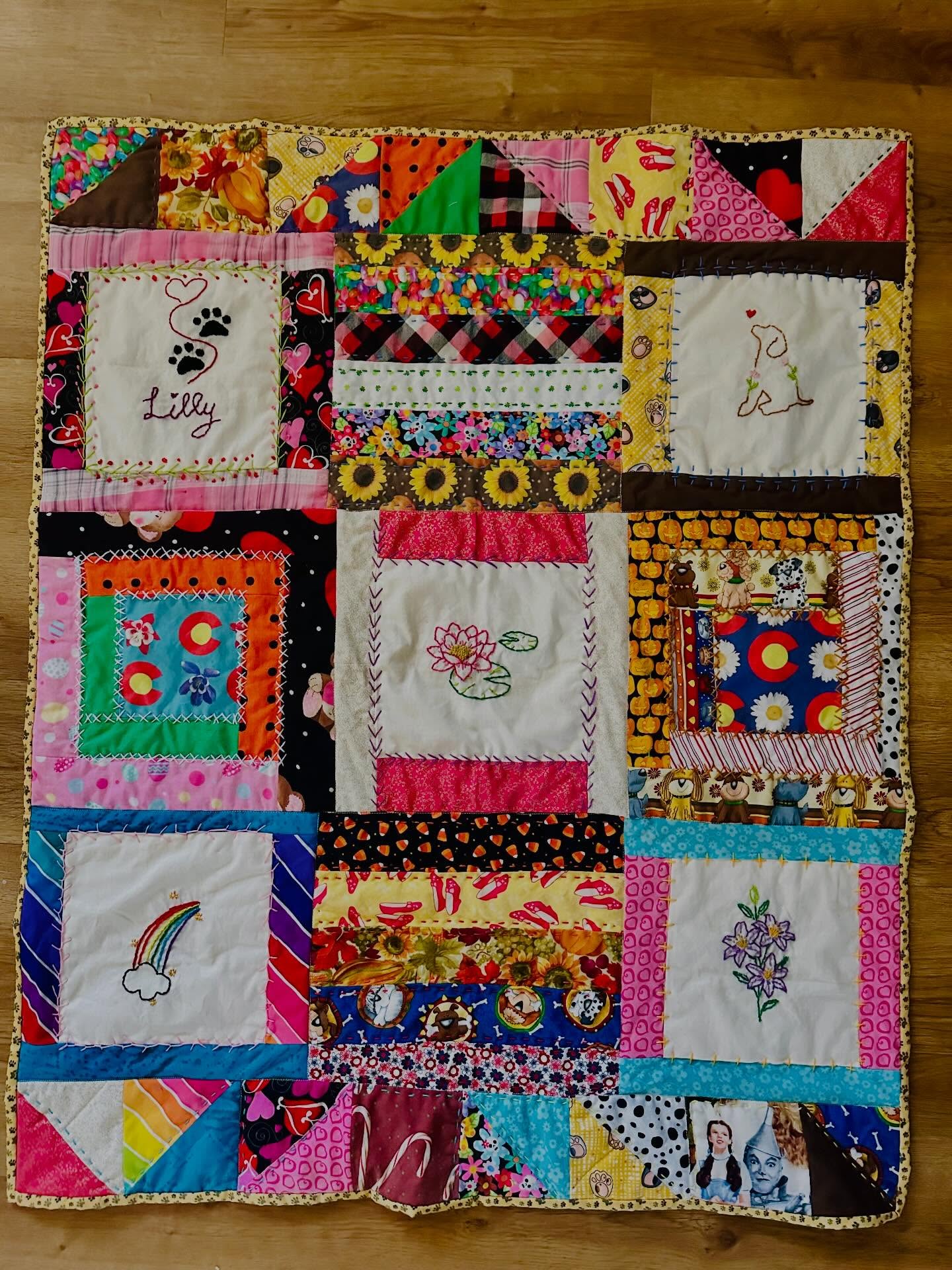 I also hand embroidered a pew patches to include in the quilt that resembled her the most including her name.