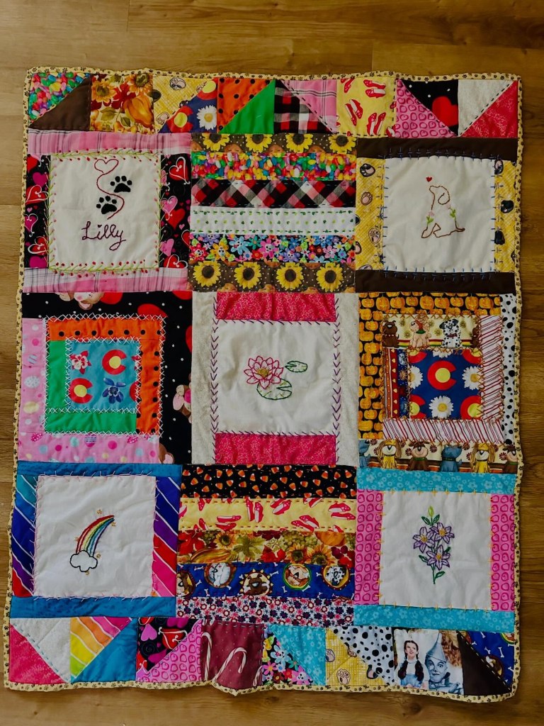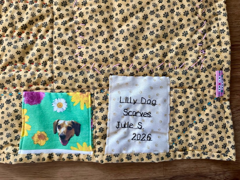 Here is the final finish. I combined all the scraps from the scarves and the embroidered patches, and finished with hand quilting and more embroidery. On the back, I included a label and a small photo of Lilly. This will eventually be hanging up in the craft room.